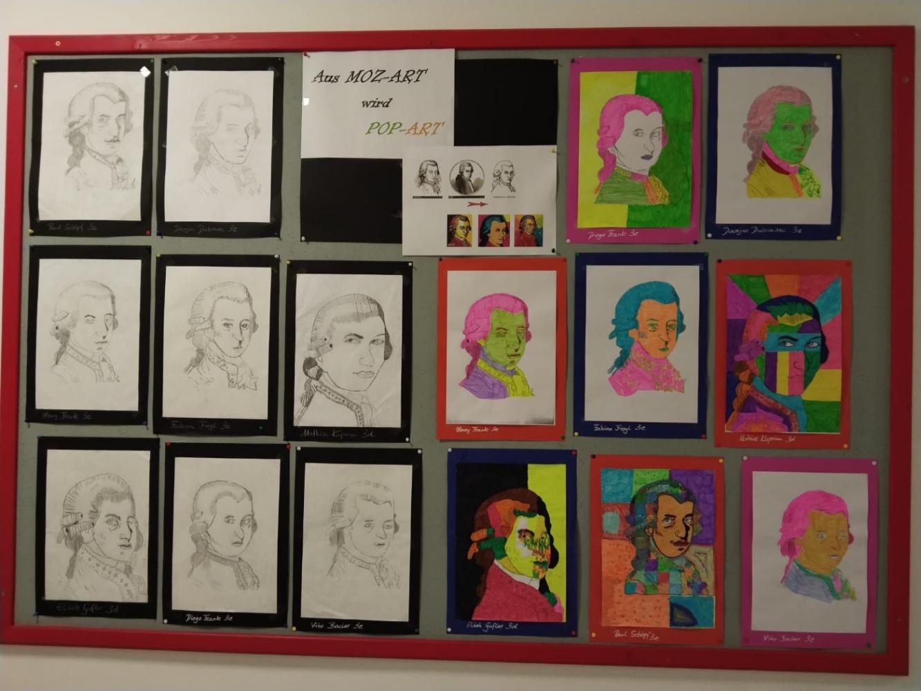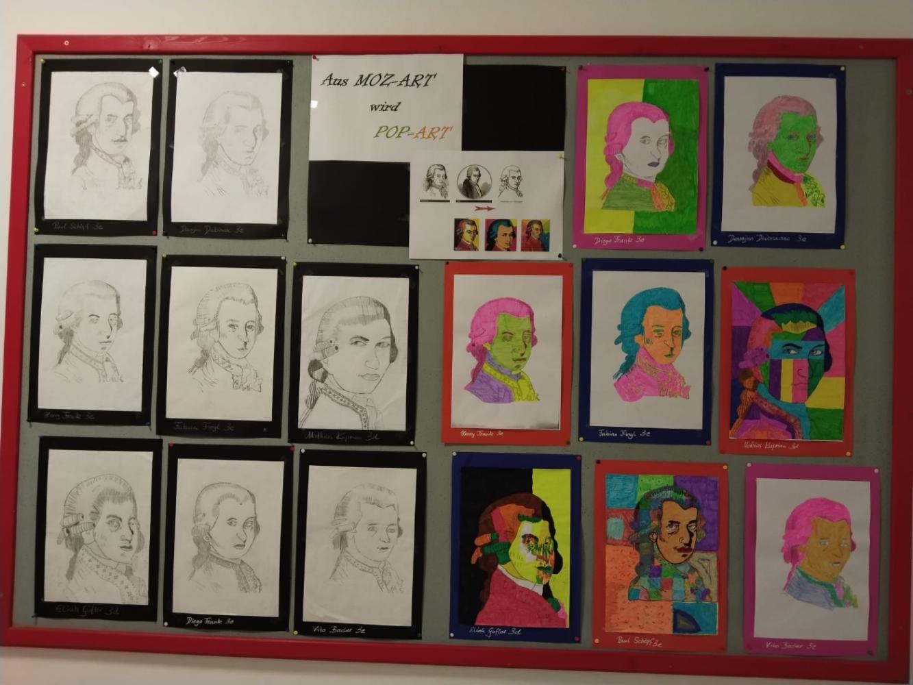 Ein Teil der Schüler der Klassen 3d und 3e gestalteten mithilfe der „Rastertechnik“ den Kopf Mozarts und anschließend nach der Vorlage von Andy Warhol denselben Kopf im „Pop-Art-Stil“. Ein nicht ganz einfaches Thema, das den „Künstlern“ der 3d und 3e hervorragend gelungen ist.