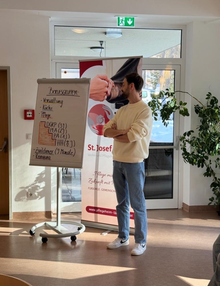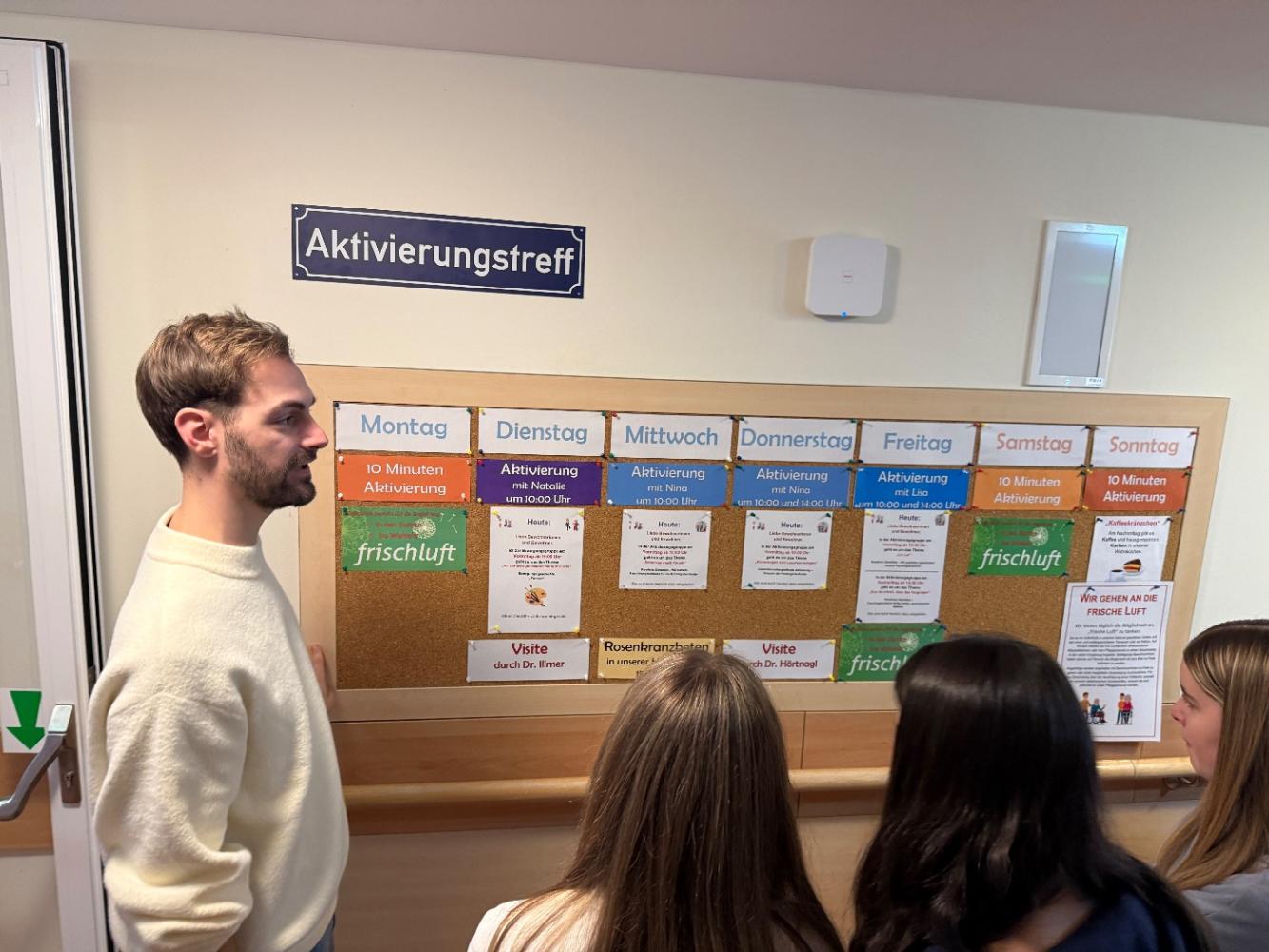 Zu Beginn erhielten wir einen Überblick über die verschiedenen beruflichen Möglichkeiten im Altenwohnheim. Dabei wurden uns unter anderem die Bereiche Pflege, Küche, Büro sowie der Zivildienst vorgestellt. Anschließend führte Patrick eine Gruppe durch das Haus und zeigte uns die schönen Zirbenstuben, ein Bewohnerzimmer, das Bad mit Hebelift, die hauseigene Kapelle sowie die Küche.